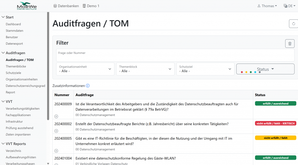 Zentraler Fragenkatalog mit über 300 anpassbaren Fragen und Filtermöglichkeiten zur Statusanalyse.