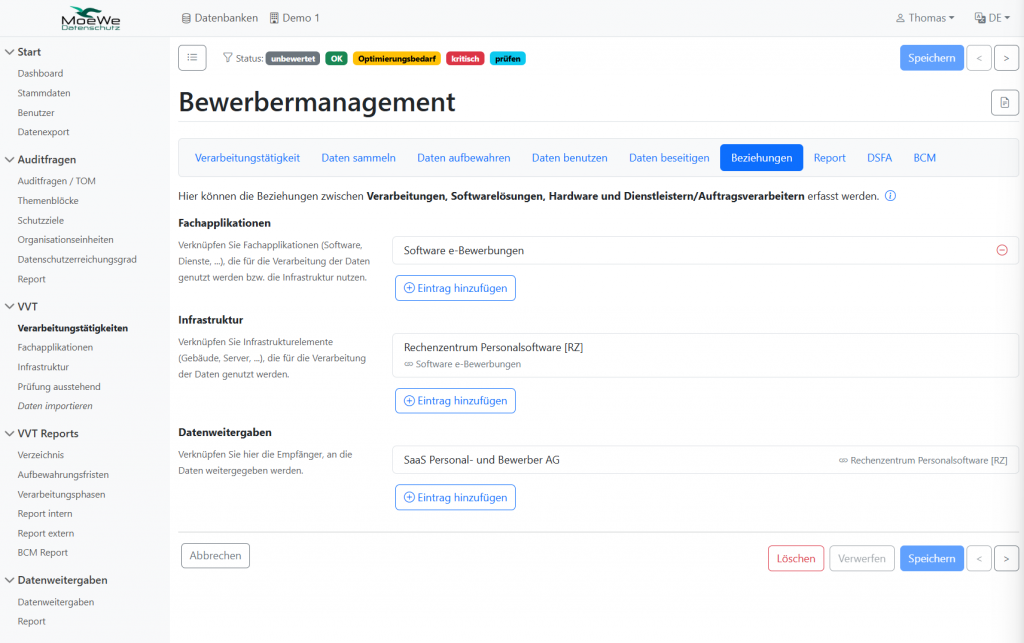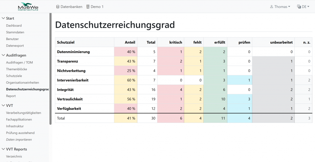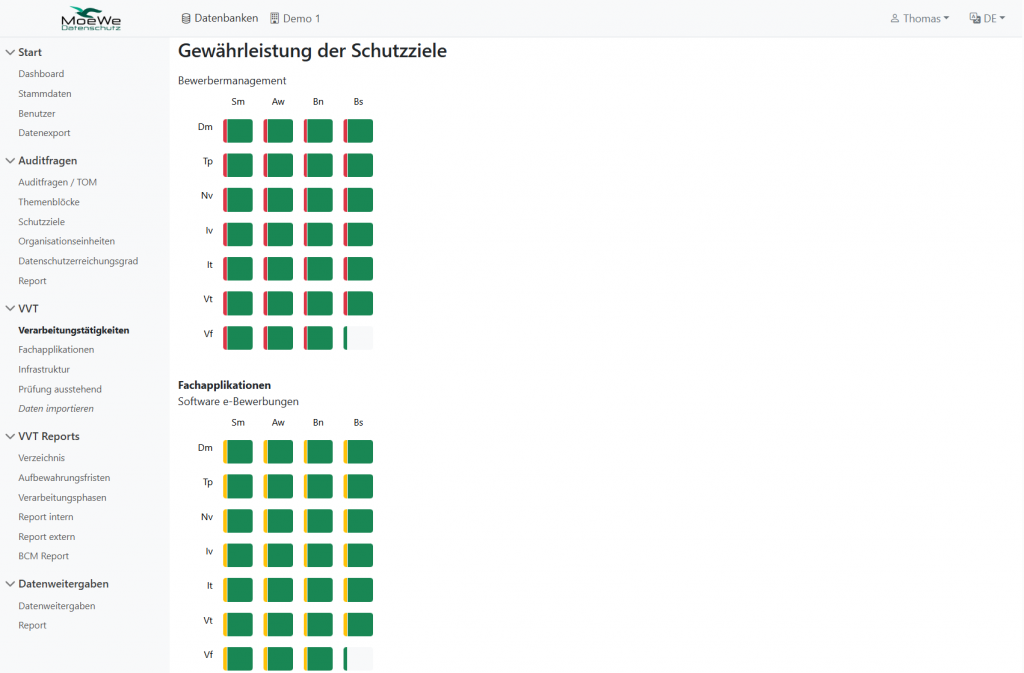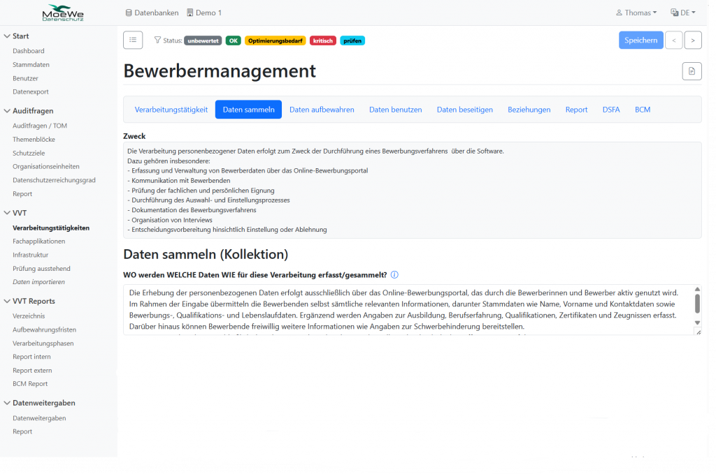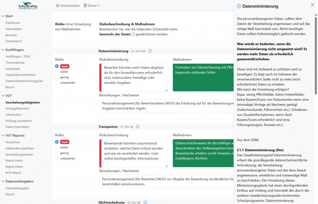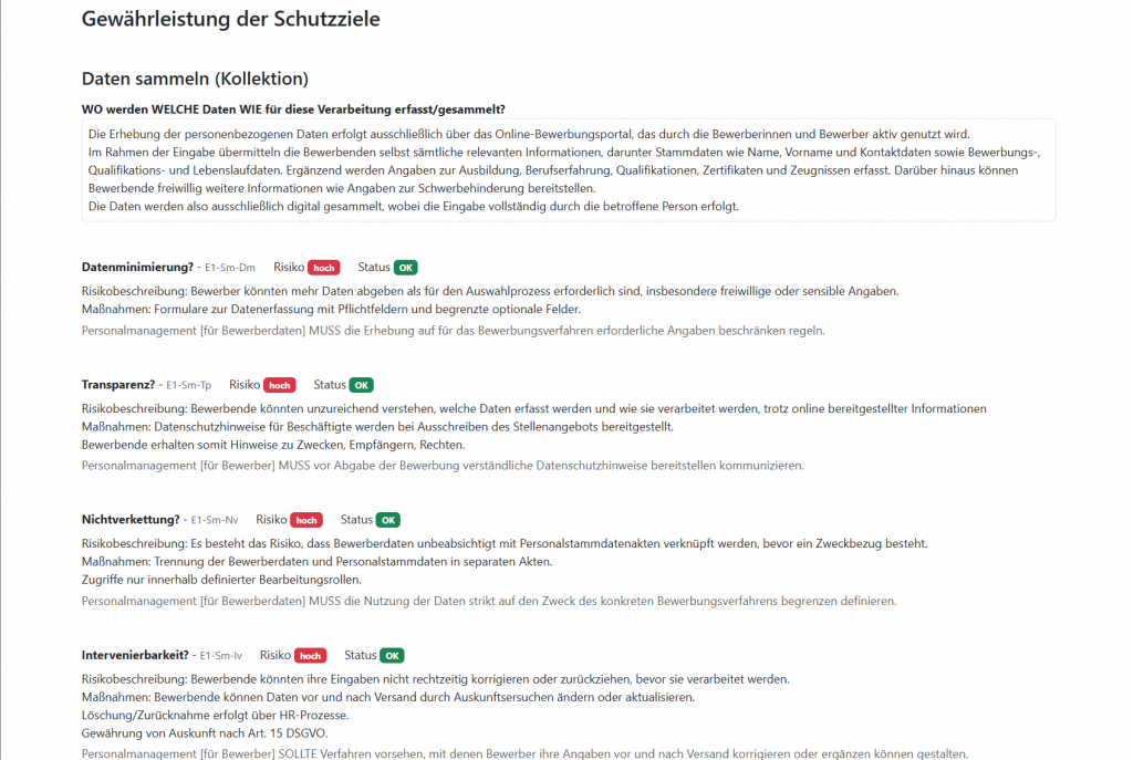 Mit wenigen Klicks bewerten Sie Risiken, Maßnahmen und Schutzziele gemäß SDM – aufgeteilt in die vier Phasen der Verarbeitung: