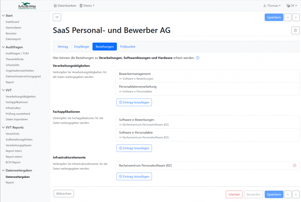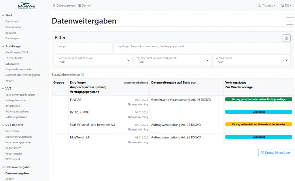 Vollständige Erfassung von Datenübermittlungen inkl. Empfänger, Rechtsgrundlagen und Vertragsstatus – verknüpfbar mit Verarbeitungstätigkeiten.